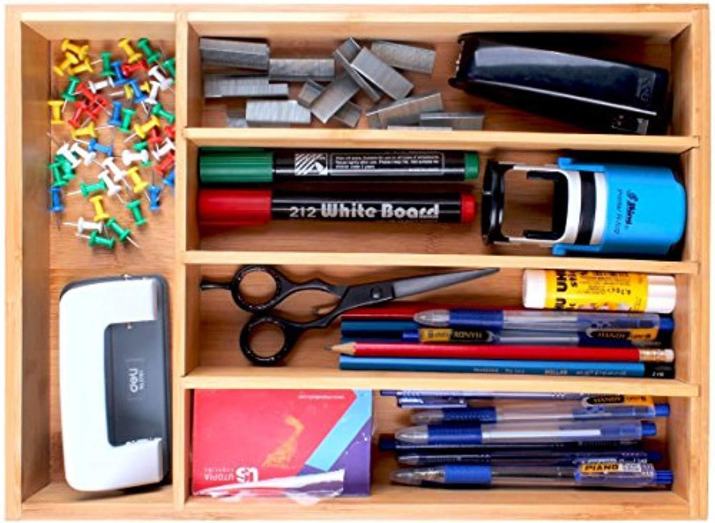 • Tray features 5 dividers that help in organizing different cutlery pieces; bamboo tray can be used in the kitchen for organizing different kitchen gadgets, in the bathroom as a cosmetics divider, and in the utility room as a hardware organizer