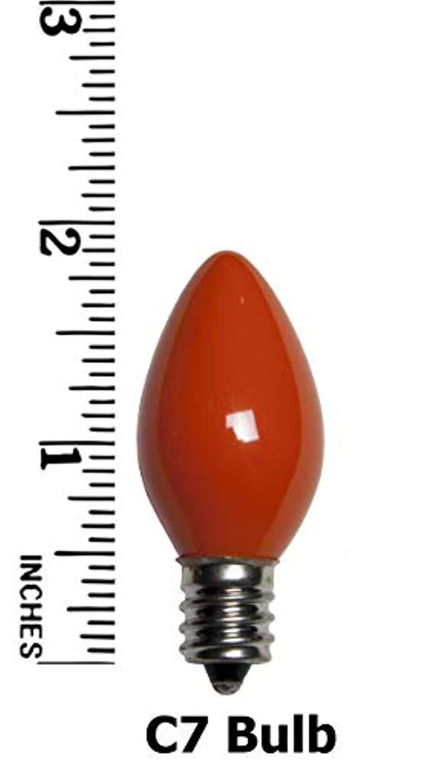 • One pack of 25 opaque multicolor C7 incandescent light bulbs (red, blue, orange, green, white) with E12 bases, ideal as Christmas lights, party lights and more. C7 bulbs are smaller than C9s, ideal for lights that will be viewed from close up, for lighting smaller Christmas trees, or anywhere you want big, fun light in a smaller, economical package.