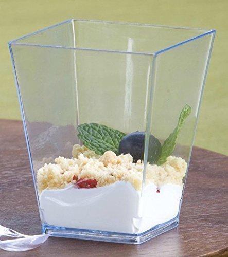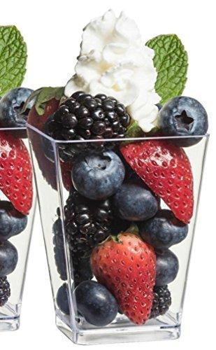 • QUALITY AND STYLE - These 5 oz Clear Plastic Cups are perfect Condiment Cups, Smoothie Cups, Containers, or Candy Dish. These Square Plastic Cups are made of Premium Quality Crystal Clear Plastic, they are Hard Plastic Cups and BPA FREE. Its elegant design is the perfect way to showcase your favorite Hors D' oeuvres, Mousses, Condiments, Tiramisu, Appetizer, or Layered Desserts at Parties, Holidays, or any Event. Perfect for on the go, and To Go Desserts