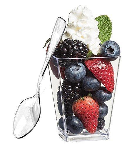 • PERFECT PLASTIC DESSERT CUPS - 50 Cups, 50 Clear Mini Spoons, Cup: Capacity: 5 ounces, Dimensions: 1.6" at the bottom, 2.3" at the top, 3" tall, Spoon measures 3.75" long; Perfect Size Individual Sampler Cups, great for Serving Ice Cream, Sundaes, Fruit, Trifles, Parfaits, Compote, Jello Shots, and Shrimp, or Party Favors; use as Cocktail Glasses, Dip Bowls, Candy Dish, Condiment Cup, Mousse Cups, Soup Cups, Trifle Bowls, Parfait Cups, Shot Glasses, and Wine Glasses